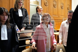 Gisele Pelicot, center, sits in the courtroom during the appeals trial in the case of a man challenging his conviction, less than a year after the landmark verdict in a drugging and rape trial that shook France Thursday, Oct. 9, 2025 in Nimes, southern France. (AP Photo/Lewis Joly)