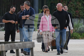 Gisele Pelicot leaves the courthouse for a break during the appeals trial in the case of a man challenging his conviction, less than a year after the landmark verdict in a drugging and rape trial that shook France Thursday, Oct. 9, 2025 in Nimes, southern France. (AP Photo/Lewis Joly)
