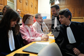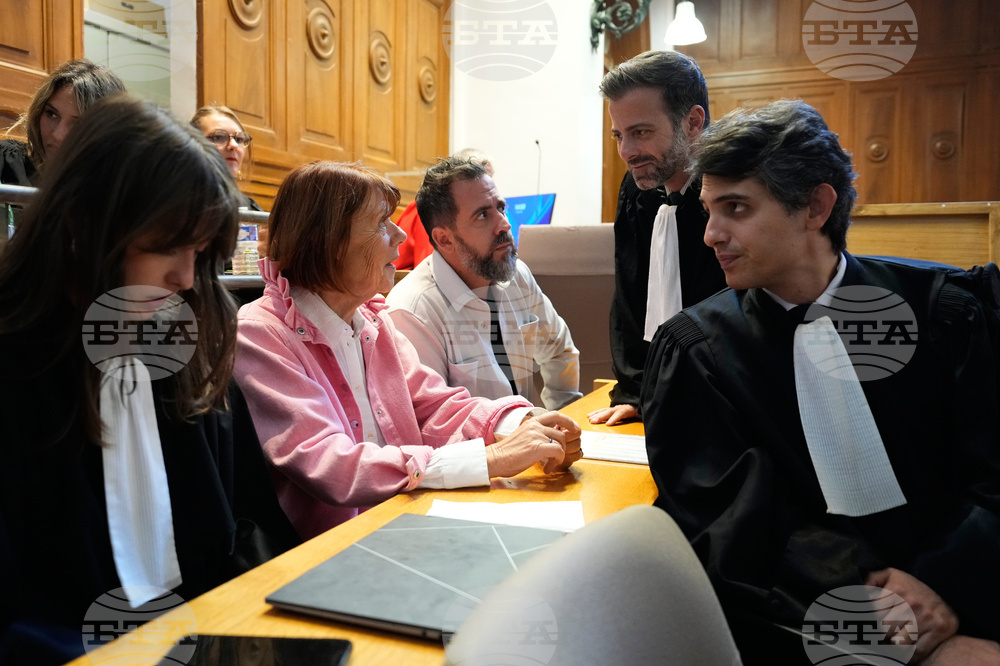 Gisele Pelicot , second left, and her son Florian Pelicot listen to her lawyers Stephane Babonneau, right, and Antoine Camus, second right, during the appeals trial in the case of a man challenging his conviction, less than a year after the landmark verdict in a drugging and rape trial that shook France Thursday, Oct. 9, 2025 in Nimes, southern France. (AP Photo/Lewis Joly)