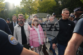 Gisele Pelicot, center, leaves the courthouse during the appeals trial in the case of a man challenging his conviction, less than a year after the landmark verdict in a drugging and rape trial that shook France Thursday, Oct. 9, 2025 in Nimes, southern France. (AP Photo/Lewis Joly)