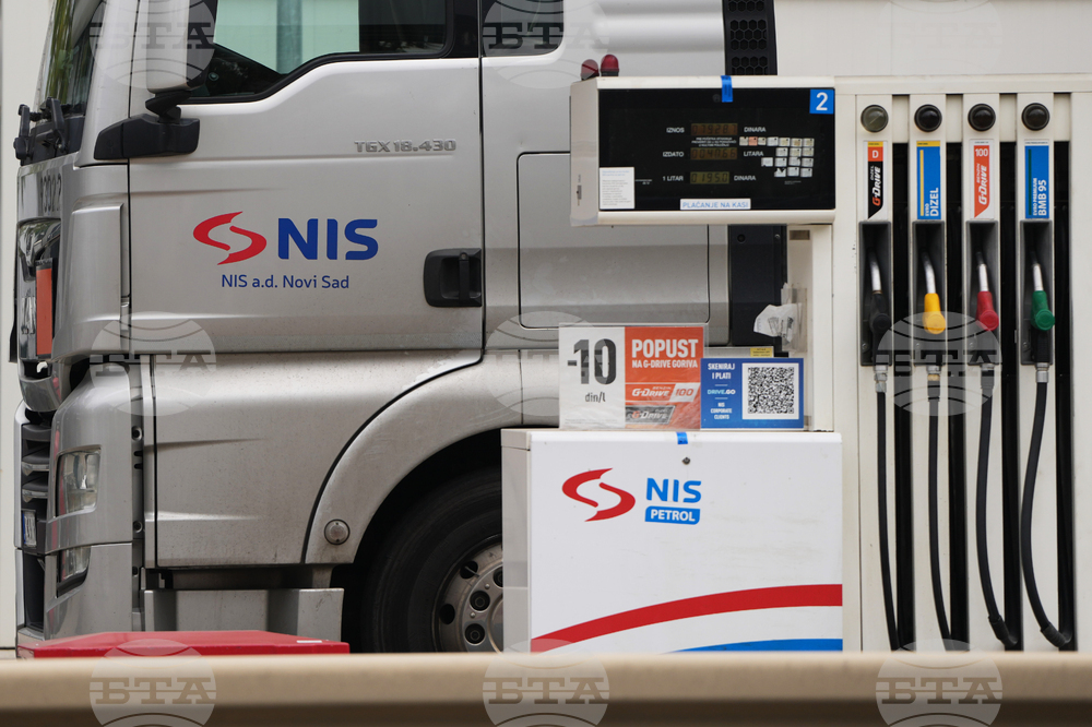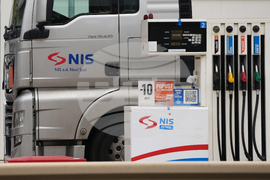 A gasoline truck of Petroleum Industry of Serbia (NIS) is parked at a petrol station in Pancevo, Serbia, Thursday, Oct. 9, 2025. (AP Photo/Darko Vojinovic)