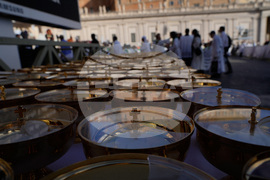 Chalices containing hosts are set on a table prior to the start of a Mass for the participants in the jubilee of ordained people with Pope Leo XIV, in St. Peter's Square, at the Vatican, Thursday, Oct. 9, 2025. (AP Photo/Gregorio Borgia)
