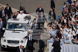 Pope Leo XIV leaves after presiding over a Mass for the participants in the jubilee of ordained people in St. Peter's Square, at the Vatican, Thursday, Oct. 9, 2025. (AP Photo/Gregorio Borgia)