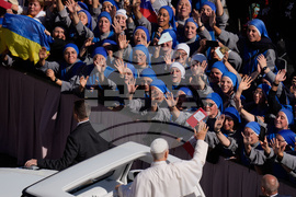 Nuns attend a Mass for the participants in the jubilee of ordained people with Pope Leo XIV, in St. Peter's Square, at the Vatican, Thursday, Oct. 9, 2025. (AP Photo/Gregorio Borgia)