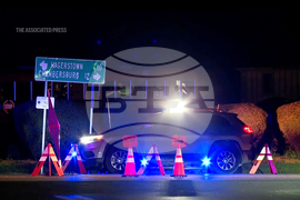 A police vehicle is seen at the site where two state police officers and a suspect were shot while officers were responding to a call, in southern Franklin County, about 85 miles (135 kilometers) northwest of Baltimore, Pa, Wednesday, Oct. 8, 2025. (WPMT/FOX43 via AP)