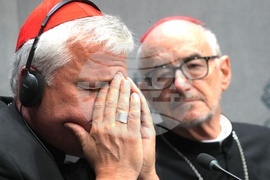 Cardinals Konrad Krajewski, left, and Michael Czerny attend a press conference at the Vatican to present Pope Leo XIV's exhortation "Dilexi te"about love for the poor, Thursday, Oct. 9, 2025. (AP Photo/Domenico Stinellis)
