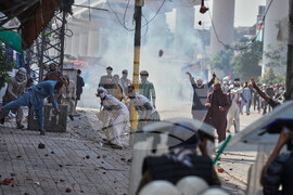 Supporters of Islamist party 'Tehreek-e-Labbaik Pakistan' throw stones toward police during clashes ahead of their pro-Palestinian march toward capital Islamabad, in Lahore, Pakistan, Friday, Oct. 10, 2025. (AP Photo/K.M. Chaudary)