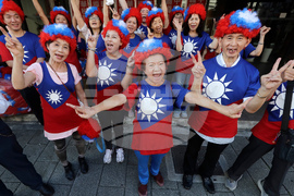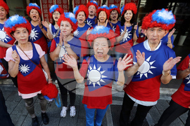 People cheer with Taiwan's national flags suits during National Day celebrations in front of the Presidential Building in Taipei, Taiwan, Friday, Oct. 10, 2025. (AP Photo/Chiang Ying-ying)