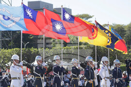 Members of an honor guard attend during National Day celebrations in front of the Presidential Building in Taipei, Taiwan, Friday, Oct. 10, 2025. (AP Photo/Chiang Ying-ying)