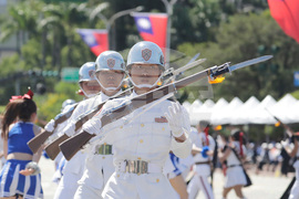 Members of an honor guard perform during National Day celebrations in front of the Presidential Building in Taipei, Taiwan, Friday, Oct. 10, 2025. (AP Photo/Chiang Ying-ying)