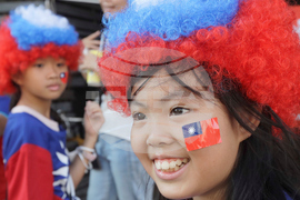 A girl shows a national flag on her face during National Day celebrations in front of the Presidential Building in Taipei, Taiwan, Friday, Oct. 10, 2025. (AP Photo/Chiang Ying-ying)