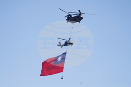 A helicopter flies over the President Office with a national flag during National Day celebrations in front of the Presidential Building in Taipei, Taiwan, Friday, Oct. 10, 2025. (AP Photo/Chiang Ying-ying)