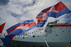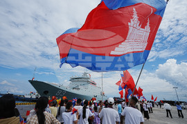 Cambodia's national flags flutter as Chinese warship Qijiguang arrives at a Cambodian commercial port in Sihanoukville, Friday, Oct. 10, 2025. (AP Photo/Heng Sinith)