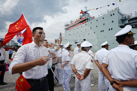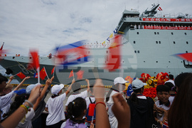 Chinese businessmen and local students gather as Chinese warship Qijiguang arrives at a commercial port in Sihanoukville, southern Cambodia, Friday, Oct. 10, 2025. (AP Photo/Heng Sinith)