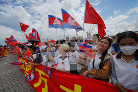 Local students wave flags as Chinese warship Qijiguang arrives at a commercial port in Sihanoukville, southern Cambodia, Friday, Oct. 10, 2025. (AP Photo/Heng Sinith)
