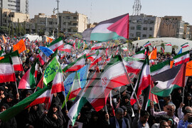 Iranian worshippers wave Iranian and Palestinian flags during an anti-Israeli rally after their Friday prayers at the Enqelab-e-Eslami (Islamic Revolution) square, in Tehran, Iran, Friday, Oct. 10, 2025. (AP Photo/Vahid Salemi)