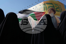 An Iranian worshipper waves a Palestinian flag in front of a portrait of the late Hezbollah leader Hassan Nasrallah, who was killed in Israeli airstrike in 2024, during an anti-Israeli rally after the Friday prayers at the Enqelab-e-Eslami (Islamic Revolution) square, in Tehran, Iran, Friday, Oct. 10, 2025. (AP Photo/Vahid Salemi)