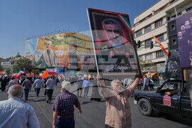 A man holds up a portrait of the late commander of Iran's Revolutionary Guard aerospace division Gen. Amir Ali Hajizadeh, who was killed in an Israeli strike in June, as a huge banner is seen at background showing the late commander of the Iran's Revolutionary Guard expeditionary Quds Force, Gen. Qassem Soleimani, left, who was killed in a U.S. drone attack in 2020, and two late Hezbollah leaders Hassan Nasrallah, center, and Hashem Safieddine, who were killed in Israeli airstrikes in 2024, during an anti-Israeli rally after the Friday prayers at the Enqelab-e-Eslami (Islamic Revolution) square, in Tehran, Iran, Friday, Oct. 10, 2025. (AP Photo/Vahid Salemi)