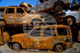 Burned government vehicles are seen inside the Parliament premises, a month after a “Gen Z” led mass anti-corruption protests in Kathmandu, Nepal, Friday, Oct. 10, 2025. (AP Photo/Niranjan Shrestha)