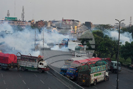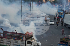 Police fire tear gas shells to disperse supporters of Islamist party 'Tehreek-e-Labbaik Pakistan' during their pro-Palestinian march toward the capital Islamabad, in Lahore, Pakistan, Friday, Oct. 10, 2025. (AP Photo/K.M. Chaudary)