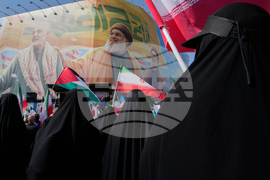 Iranian worshippers wave Palestinian and Iranian flags in front of a banner showing the late commander of the Iran's Revolutionary Guard expeditionary Quds Force, Gen. Qassem Soleimani, left, and two late Hezbollah leaders Hassan Nasrallah, center, and Hashem Safieddine, during an anti-Israeli rally after the Friday prayers at the Enqelab-e-Eslami (Islamic Revolution) square, in Tehran, Iran, Friday, Oct. 10, 2025. (AP Photo/Vahid Salemi)