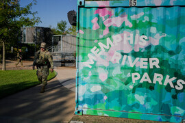 Members of the National Guard patrol a park along the Mississippi River, Saturday, Oct. 11, 2025, in Memphis, Tenn. (AP Photo/George Walker IV)