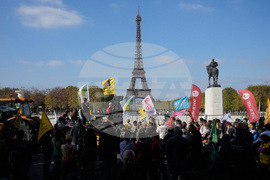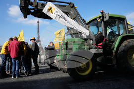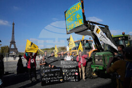 French farmers protest against the Mercosur trade alliance with South America countries Tuesday, Oct. 14, 2025 near the Eiffel Tower in Paris. (AP Photo/Michel Euler)