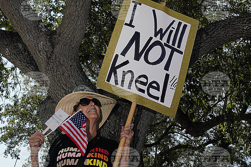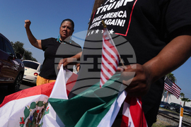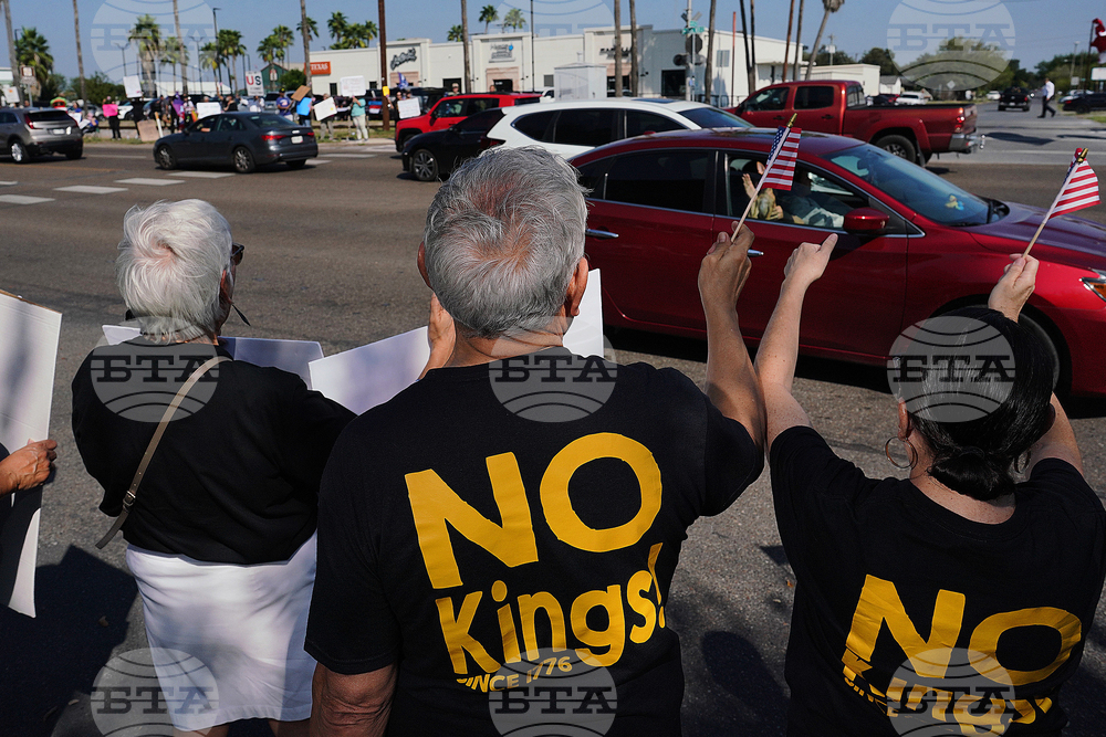 Participants show disapproval at a No Kings protest along Business 83 near Bentsen Tower in McAllen, Texas, Saturday, Oct. 18, 2025. (Joel Martinez/The Monitor via AP)