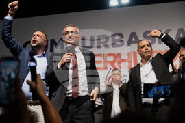 Turkish Cypriot newly elected leader Tufan Erhurman, center, talks to supporters after winning the leadership election in the Turkish occupied northern part of the divided capital Nicosia, Cyprus, Sunday, Oct. 19, 2025. (AP Photo/Nedim Enginsoy)