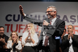 Turkish Cypriot newly elected leader Tufan Erhurman waves to supporters after winning the leadership election in the Turkish occupied northern part of the divided capital Nicosia, Cyprus, Sunday, Oct. 19, 2025. (AP Photo/Nedim Enginsoy)
