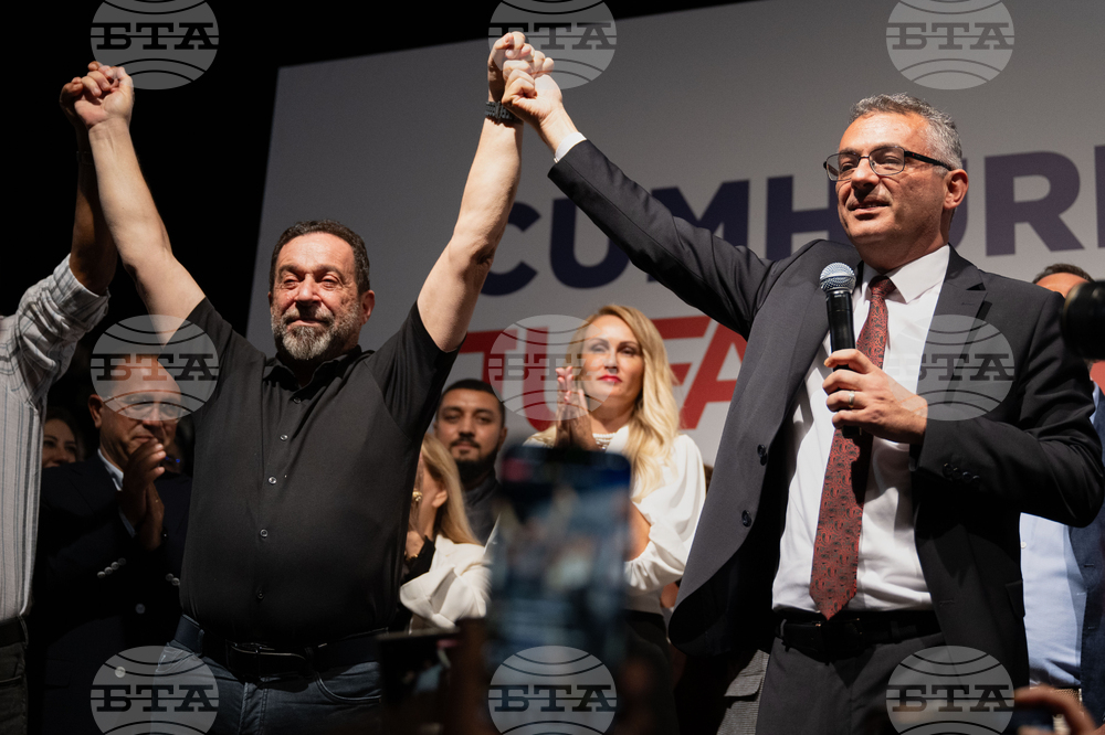 Turkish Cypriot newly elected leader Tufan Erhurman, right, and Serdar Denktash, son of the former Turkish Cypriot leader Rauf Denktash, celebrate after winning the leadership election in the Turkish occupied northern part of the divided capital Nicosia, Cyprus, Sunday, Oct. 19, 2025. (AP Photo/Nedim Enginsoy)