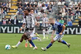 Juventus' Khephren Thuram, left, and Como's Ivan Smolcic challenge for the ball during the Serie A soccer match between Como and Juventus at the Giuseppe Sinigaglia stadium in Como, north Italy - October 19, 2025 Sport - Soccer. (Photo by Antonio Saia/LaPresse)/LaPresse via AP)