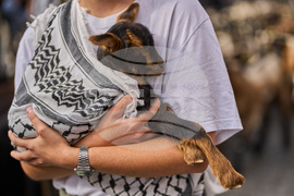 A baby goat is carried in arms through central Madrid, Spain, as shepherds lead the animals through the streets in defense of ancient grazing and migration rights, Sunday, Oct. 19, 2025. (AP Photo/Manu Fernandez)