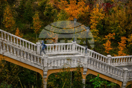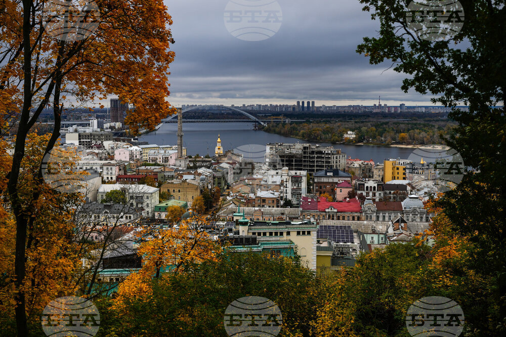 Girls take photos overlooking the Dnieper River, Sunday, Oct. 19, 2025, in Kyiv, Ukraine. (AP Photo/Julia Demaree Nikhinson)