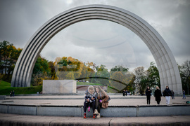 A couple sits in front of the Arch of Freedom of the Ukrainian People, Sunday, Oct. 19, 2025, in Kyiv, Ukraine. (AP Photo/Julia Demaree Nikhinson)