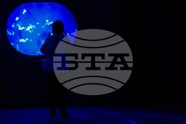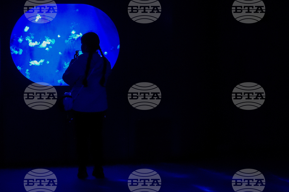 A girl looks at jellyfish at a museum, Sunday, Oct. 19, 2025, in Kyiv, Ukraine. (AP Photo/Julia Demaree Nikhinson)