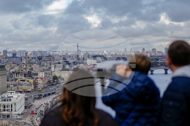 A boy looks through tower binoculars, Sunday, Oct. 19, 2025, in Kyiv, Ukraine. (AP Photo/Julia Demaree Nikhinson)