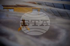 A gold statue is reflected in a puddle in Independence Square, Sunday, Oct. 19, 2025, in Kyiv, Ukraine. (AP Photo/Julia Demaree Nikhinson)