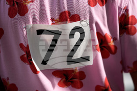 A competitor wears his number pinned to his shirt before starting in the St. Anthony Valley Slope amateur cycling race on a 450 meters (yards) long steep cobblestone street in Lisbon, Sunday, Oct. 19, 2025. (AP Photo/Armando Franca)