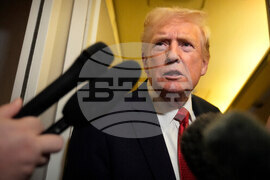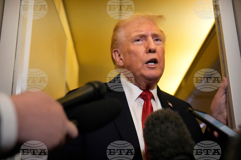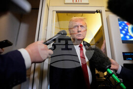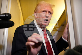 President Donald Trump speaks to reporters aboard Air Force One, Sunday, Oct. 19, 2025, en route to Joint Base Andrews, Md., as he returns from a trip to Florida. (AP Photo/Mark Schiefelbein)