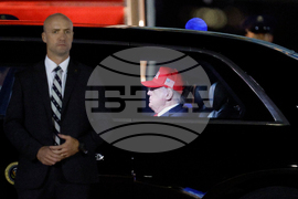 A U.S. Secret Service agent, left, stands next to President Donald Trump's limousine as Trump, right, exits the back seat upon his arrival at Joint Base Andrews, Md., Sunday, Oct. 19, 2025, after visiting his Mar-a-Lago estate in Palm Beach, Fla. (AP Photo/Luis M. Alvarez)