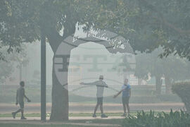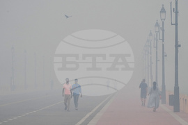 People walk in the morning near the India Gate monument amidst morning smog a day after Diwali festival in New Delhi, India, Tuesday, Oct. 21, 2025. (AP Photo/Manish Swarup)