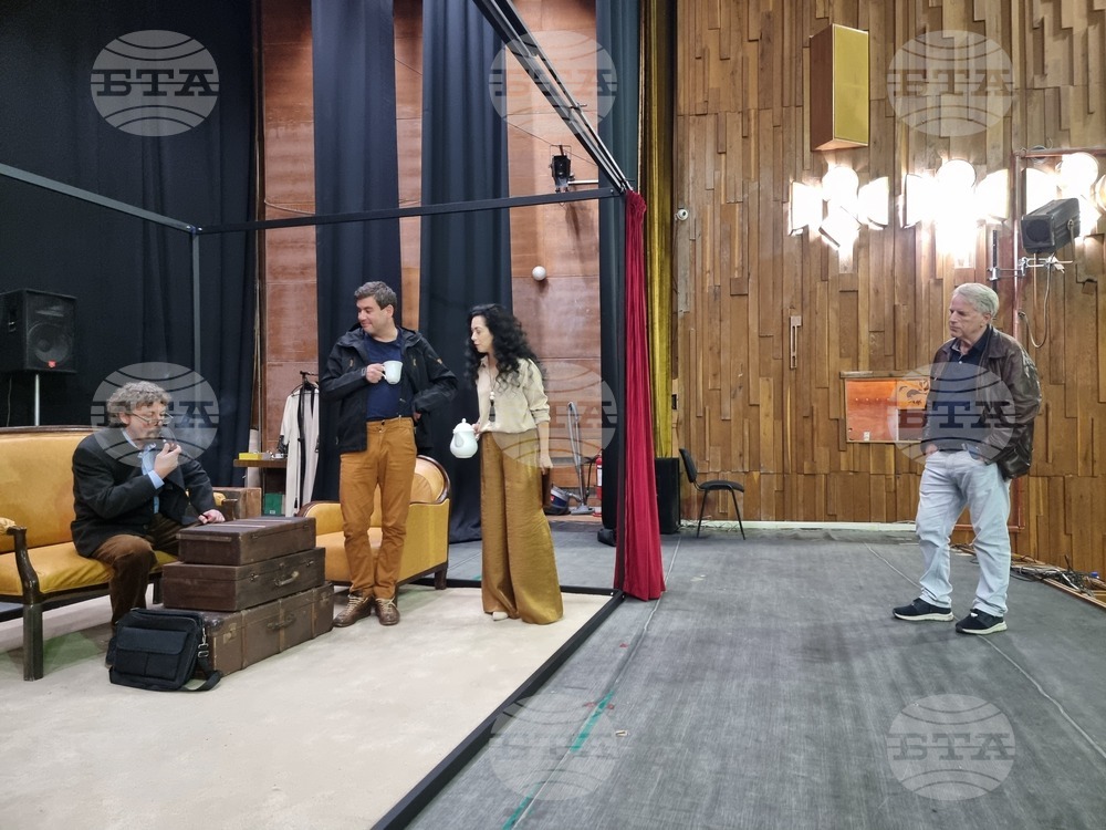 Ямбол (20 септември 2025) Репетиция на постановката „За кого се вдига завесата“ по пиесата на Магда Борисова. Спектакълът ще бъде поставен за първи път на сцена у нас от режисьора Бойко Илиев заедно с ямболския Драматичен театър „Невена Коканова“. Сценографията е дело на Антония Соколова. На сцената публиката ще види актьорите от трупата на ямболския театър Милен Каракамушев, Димитър Димитров и Георги Ружичка. Единствената женска роля е поверена Елена Петрова. Премиерата ще е на 2 октомври на ямболска сцена. Със спектакъла театър „Невена Коканова“ открива новия си творчески сезон. На снимката (от ляво надясно): актьорът Георги Ружичка, актьорът Милен Каракамушев, актрисата Елена Петрова и режисьорът Бойко Илиев.
