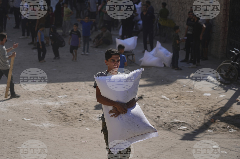 Палестинци носят чували с хуманитарна помощ - снимка: AP/Jehad Alshrafi