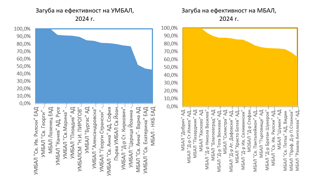 УМБАЛ и МБАЛ са с основополагаща роля в болничната система – малки промени в начина на тяхното управление и функциониране имат много значим ефект. Анализът разкрива средна загуба на ефективност, представена като дял от разходите на изследваните болници, от 19,3% при УМБАЛ и 16,1% при държавните МБАЛ. Това , означава, че през 2024 г. ресурс в размер на съответно 347 млн. лв. (УМБАЛ) и 94 млн. лв. (МБАЛ) би могъл потенциално да се използва по-добре.