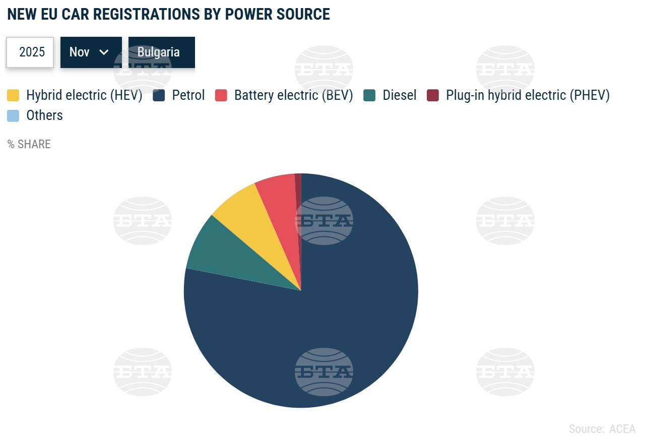 Най-голям дял от новите регистрации в ЕС през ноември са заемали хибридни електрически автомобили (HEV) – 34 на сто, следвани от бензиновите модели (23,3 на сто), задвижваните изцяло от батерии (21,3 на сто), плъгин хибридните коли (PHEV – 10,3 на сто), дизеловите модели (7,9 на сто) и модели с различно от изброените задвижвания (3,2 на сто).