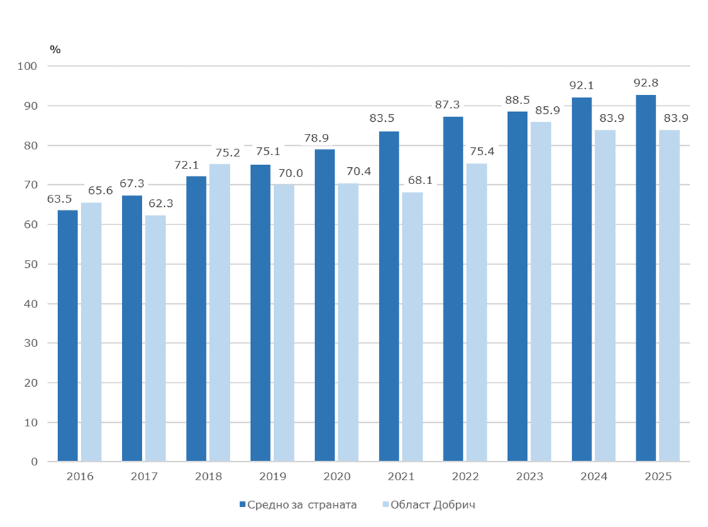 Резултатите от проведеното изследване за използване на ИКТ в домакинствата и от лицата показват, че през 2025 г. 83.9% от домакинствата в област Добрич (92.8% средно за страната) имат достъп до интернет в домовете си. За периода 2016 –