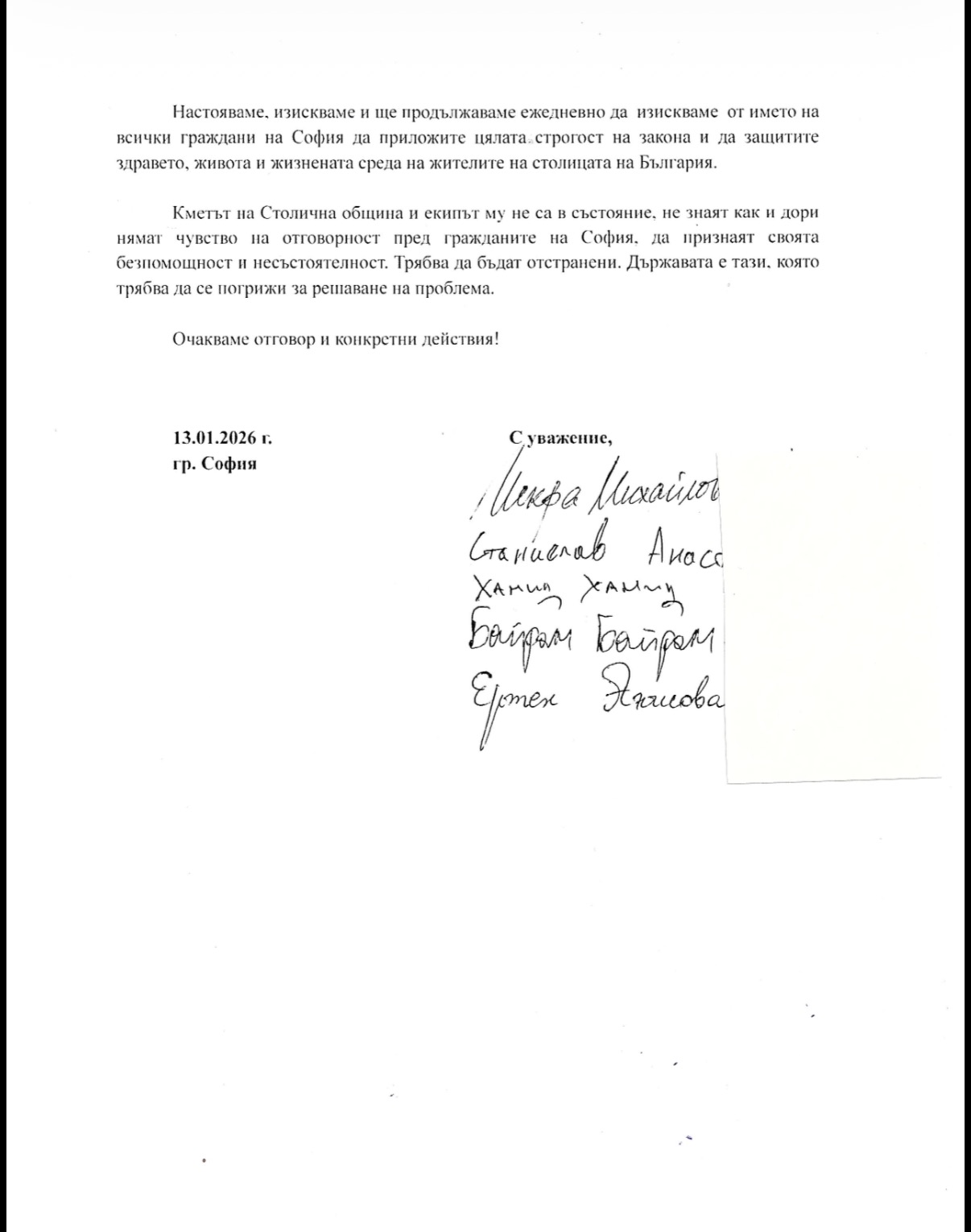 Настояваме, изискваме и ще продължаваме ежедневно да изискваме от името на всички граждани на София да приложите цялата строгост на закона и да защитите здравето, живота и жизнената среда на жителите на столицата на България.