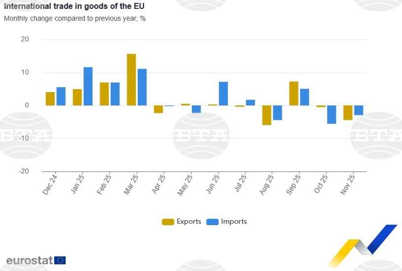 През периода септември-ноември 2025 г. износът от еврозоната към страни извън валутната зона се е увеличил с 1,3 на сто, докато вносът е намалял с 1,8 на сто. Търговията в рамките на еврозоната през този период се е увеличила с 0,1 на сто.