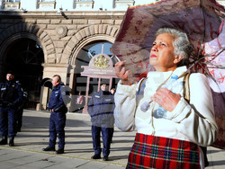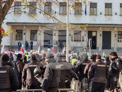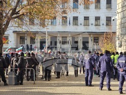 Привърженици на партия „Величие“ са се събрали на протест пред сградата на БНБ. Те са оградени от полицейски кордон. Развяват знамена.